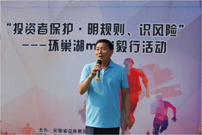 上午八點二十,濱湖新天地廣場上人頭攢動、旌旗招展,參加此次活動的全體員工在這里集合完畢?;顒娱_始前,安徽省證券期貨業(yè)協(xié)會副會長、秘書長鐘自木代表協(xié)會致辭。