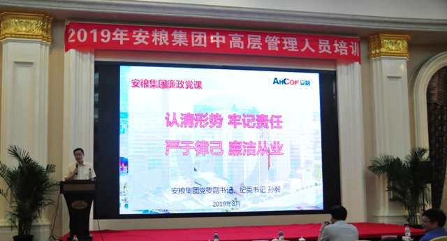 為深入推進“不忘初心、牢記使命”主題教育,深化落實 “三個以案”教育,8月16日至17日,安糧集團黨委副書記、紀(jì)委書記孫毅在安糧集團2019年中高層管理人員培訓(xùn)期間,為參加學(xué)習(xí)的安糧集團、控股本部及貿(mào)易、建工兩大板塊的120多名黨員干部講授題為《認(rèn)清形勢 牢記責(zé)任 嚴(yán)于律己 廉潔從業(yè)》專題廉政黨課。