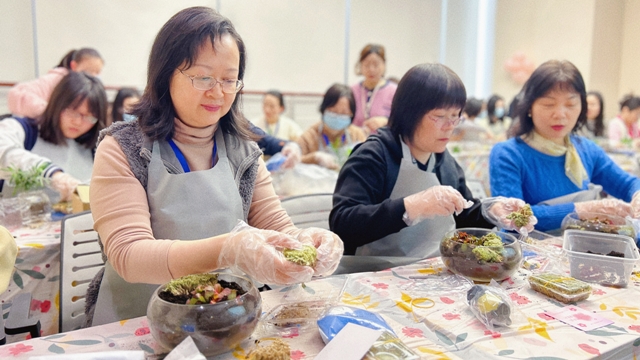 微景觀是將苔蘚、多肉等植物配以砂石、泥土、玩偶裝進(jìn)容器,構(gòu)成妙趣橫生的微觀世界,一個微景觀本質(zhì)上也是一個小型生態(tài)系統(tǒng)。女職工們在老師的指導(dǎo)下開始微景觀DIY活動,大家認(rèn)真構(gòu)思造型,充分發(fā)揮創(chuàng)造力,不一會兒,一份份清新雅致的微景觀作品便呈現(xiàn)在大家面前。在家中、辦公室的案頭擺上一盆,勞累疲乏時抬頭瞥見那一抹綠色,仿佛跌落到一個簡單純凈的童話世界。