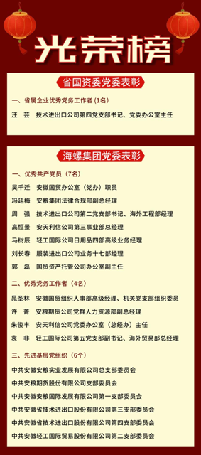 近日,省國資委黨委、海螺集團(tuán)黨委分別開展了省屬企業(yè)和集團(tuán)優(yōu)秀共產(chǎn)黨員、優(yōu)秀黨務(wù)工作者、先進(jìn)基層黨組織表彰,安徽國貿(mào)所屬技術(shù)進(jìn)出口公司汪蕓同志榮獲省屬企業(yè)優(yōu)秀黨務(wù)工作者稱號(hào),吳千遷等7名同志榮獲集團(tuán)優(yōu)秀共產(chǎn)黨員稱號(hào),晁圣林等4名同志榮獲集團(tuán)優(yōu)秀黨務(wù)工作者稱號(hào),安糧實(shí)業(yè)公司黨總支等6個(gè)基層黨組織榮獲集團(tuán)先進(jìn)基層黨組織稱號(hào)。