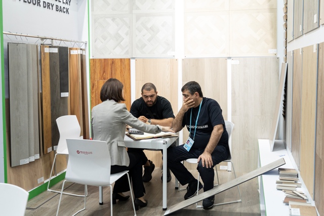 建材展位展品主要為室內(nèi)強(qiáng)化木地板、防水木地板、石塑SPC及WPC地板等。到訪客戶大多來(lái)自南美,也有部分中東、歐洲等國(guó)的新客戶。結(jié)合目標(biāo)市場(chǎng),業(yè)務(wù)部提前準(zhǔn)備了最新流行的木紋拼花地板等產(chǎn)品,其獨(dú)特的款式和顏色吸引了眾多新老客戶駐足洽談。