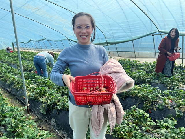 連片的草莓棚里,顆顆草莓飽滿、香甜,透著勃勃生機(jī),甜蜜的香氣撲鼻而來。大家按捺不住興奮的心情,提著小框穿梭在草莓田間精挑細(xì)選,或駐足合影、或互相幫助,不一會兒,筐子里已是碩果累累,收獲的喜悅溢于言表。采摘的同時,果園負(fù)責(zé)人還為大家介紹了草莓品種、草莓的栽培方法和現(xiàn)代農(nóng)業(yè)發(fā)展?fàn)顩r。