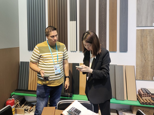 建材展位重點(diǎn)推出了墻板,格柵,樓梯踏板以及木塑戶外地板等新產(chǎn)品,從室內(nèi)到戶外產(chǎn)品一應(yīng)俱全。參展部門根據(jù)對(duì)去年秋季交易會(huì)的考察分析以及近期客戶最新詢盤(pán)情況的整合梳理,積極開(kāi)拓更新參展產(chǎn)品。結(jié)合國(guó)外最新流行的趨勢(shì),推出了拼花木紋,石紋等當(dāng)下十分暢銷的花色。利用立體燈箱,將產(chǎn)品優(yōu)勢(shì),產(chǎn)品結(jié)構(gòu)剖面等信息直觀展示,讓客戶更加清晰地了解產(chǎn)品的性能和優(yōu)點(diǎn),吸引諸多專業(yè)買家的觀看和洽談。此外,在攤位新增產(chǎn)品拼裝的體驗(yàn)區(qū),增加產(chǎn)品小樣及配件的DIY拼裝,吸引客戶自己動(dòng)手,大大提升了參與度和體驗(yàn)感,讓客戶真切地感受到安糧的誠(chéng)意與新意。