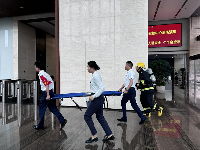 6月24日下午3時(shí),消防應(yīng)急演練總指揮下達(dá)演練開(kāi)始指令。隨著煙霧彈在辦公樓內(nèi)拋擲,煙霧觸發(fā)安糧中心辦公樓火警警報(bào),頓時(shí)消防警報(bào)和消防警鈴響起。隨后各小組迅速按照部署展開(kāi)滅火救援行動(dòng),消防和應(yīng)急救援隊(duì)員有序引導(dǎo)員工緊急疏散撤離至避難層,緊接著包河區(qū)應(yīng)急救援大隊(duì)消防救援車(chē)輛到達(dá)現(xiàn)場(chǎng),開(kāi)展了火情偵查、外圍滅火等系列滅火救援行動(dòng)。整個(gè)演練過(guò)程中,各小組配合默契、分工有序,圓滿(mǎn)完成了緊急報(bào)警、警戒疏散、醫(yī)療救護(hù)和滅火救援等演練環(huán)節(jié),及時(shí)排除了火災(zāi)險(xiǎn)情,有效達(dá)到了演練目的和預(yù)期效果。