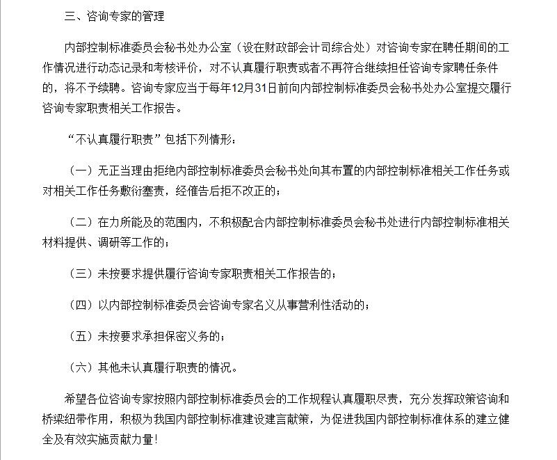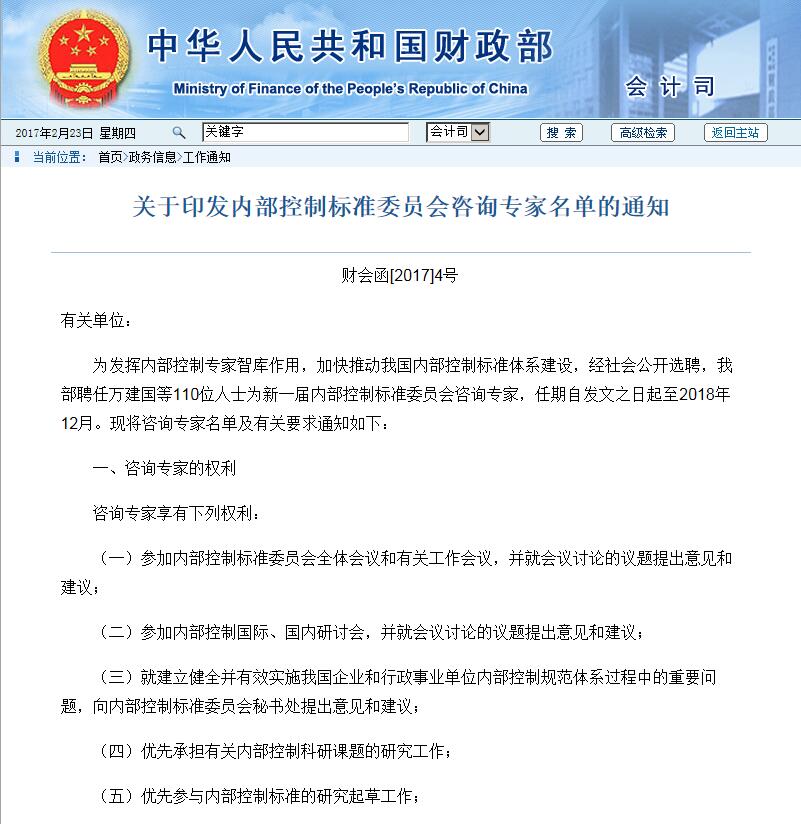《關(guān)于印發(fā)內(nèi)部控制標(biāo)準(zhǔn)委員會咨詢專家名單的通知》 http://kjs.mof.gov.cn/zhengwuxinxi/gongzuotongzhi/201702/t20170215_2535525.html