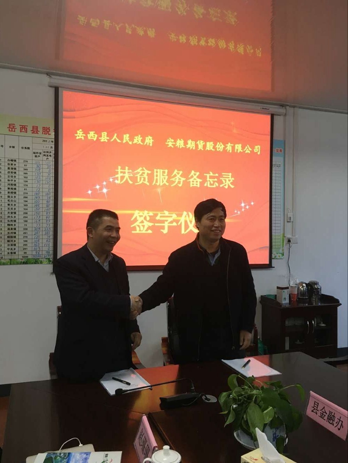 2017年3月22日,安糧期貨董事長朱中文、總經(jīng)理余萍一行前往岳西縣與當(dāng)?shù)卣炗喠恕斗鲐毞?wù)備忘錄》。簽約儀式在岳西縣扶貧辦舉行,岳西縣委副書記徐昭,副縣長孫斌出席會(huì)議并發(fā)言,副縣長方紹武主持會(huì)議,縣金融辦、縣扶貧辦、縣農(nóng)委等相關(guān)領(lǐng)導(dǎo)出席了此次簽約儀式。