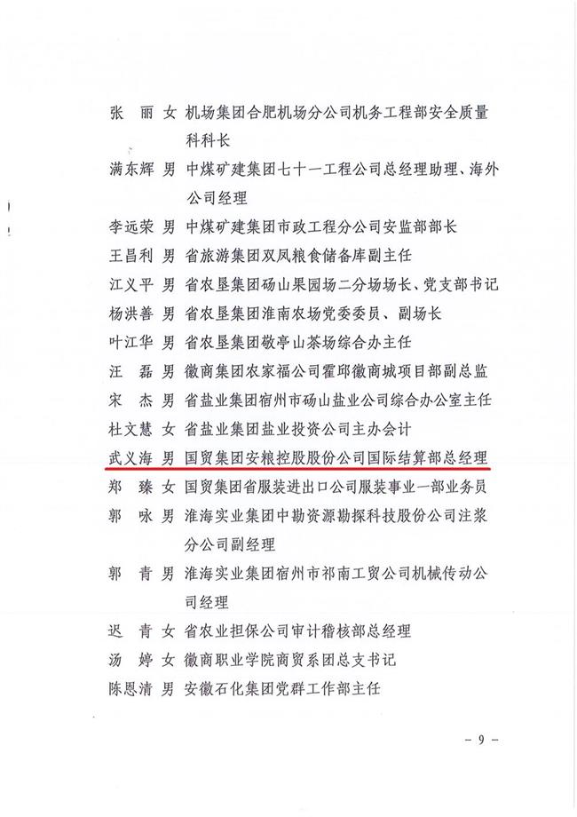為大力弘揚(yáng)黨的優(yōu)良傳統(tǒng)和作風(fēng),激勵省屬企業(yè)廣大基層黨組織和共產(chǎn)黨員在各自工作中充分發(fā)揮戰(zhàn)斗堡壘和先鋒模范作用,七一前夕,省國資委黨委下發(fā)《關(guān)于表彰省屬企業(yè)先進(jìn)基層黨組織優(yōu)秀共產(chǎn)黨員優(yōu)秀基層黨組織書記優(yōu)秀黨務(wù)工作者的決定》,安糧控股國際結(jié)算部總經(jīng)理武義海同志榮獲安徽省國資系統(tǒng)“優(yōu)秀共產(chǎn)黨員”稱號。