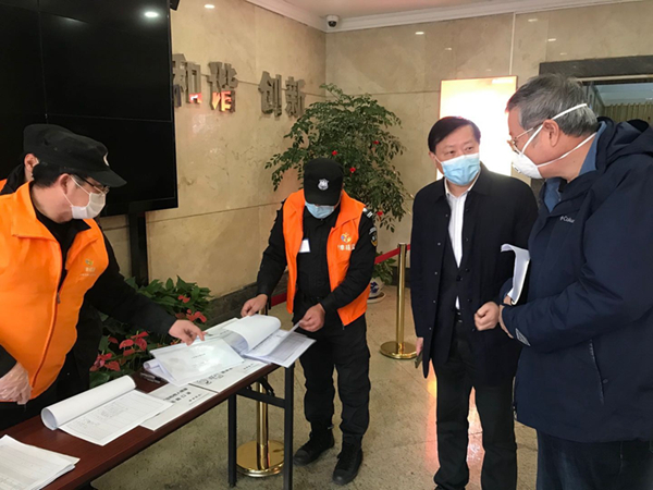 在盛安廣場(chǎng)一樓大廳,包總一行主動(dòng)接受體溫測(cè)量和登記,現(xiàn)場(chǎng)檢查了測(cè)溫、消毒及人員進(jìn)出登記工作,聽(tīng)取了現(xiàn)場(chǎng)工作人員的情況匯報(bào),對(duì)他們的辛勤工作表示慰問(wèn)和感謝,充分肯定了公司疫情防控工作。
