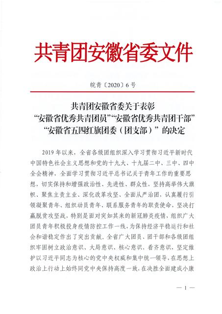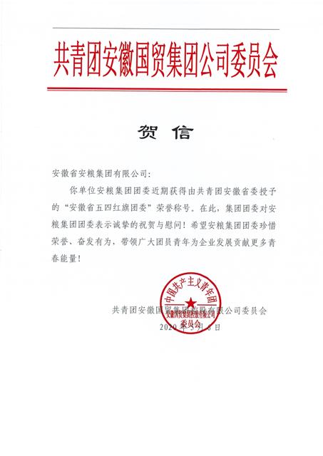 近日,共青團安徽省委下發(fā)《關(guān)于表彰 2019 年度“安徽省優(yōu)秀共青團員”“安徽省優(yōu)秀共青團干部”“安徽省五四紅旗團委 (團支部)”的決定》(皖青〔2020〕6號)》,安糧集團團委被授予“安徽省五四紅旗團委”稱號。