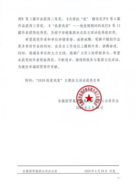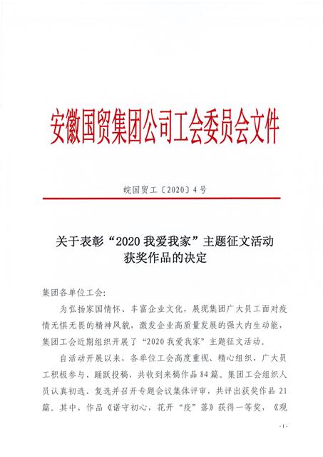 為弘揚家國情懷、豐富企業(yè)文化,國貿集團工會組織開展了“2020我愛我家”主題征文活動。安糧集團工會積極參與,最終斬獲多項獎項,以最佳的姿態(tài)畫上圓滿的句號。