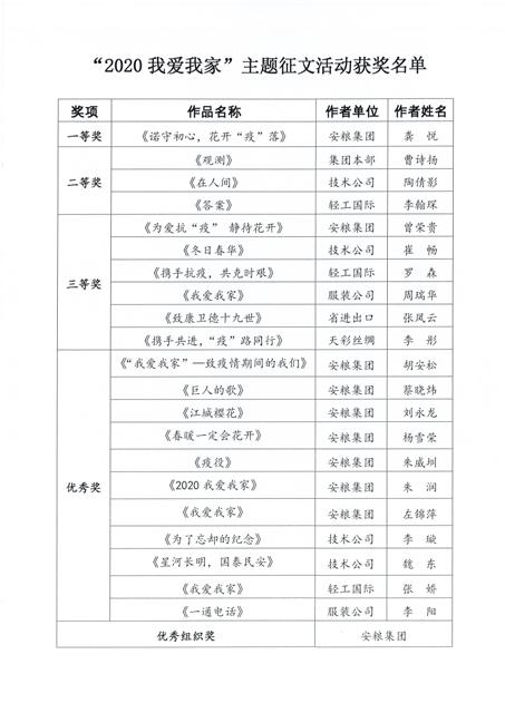 安糧集團工會自接到通知后,組織各分工會、工會小組積極動員員工,踴躍投稿,共征得稿件42篇,占國貿集團總投稿數84篇的一半。最終,安糧期貨龔悅的《諾守初心,花開“疫”落》和安糧實業(yè)曾榮貴的《為愛抗“疫” 靜待花開》分別榮獲一等獎和三等獎,安糧控股蔡曉煒的《巨人的歌》等7篇作品榮獲優(yōu)秀獎。安糧集團因高度重視、精心組織,特別榮獲優(yōu)秀組織獎。