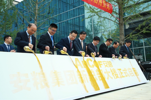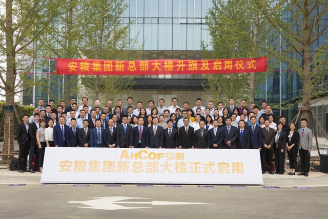 升旗儀式上,鮮艷的五星紅旗在莊嚴的國歌聲中緩緩升起,參加活動的全體人員向國旗行注目禮。啟用儀式上,曹訓立董事長、方宗友總裁等集團領導在大家的熱烈掌聲和見證下,共同舉起金瓶將鎏金沙傾倒在啟用展板上,展板顯示出“安糧集團新總部大樓正式啟用”的字樣,活動進入高潮。隨后,全體人員在安糧中心總部大樓前合影留念,隨著快門定格時間的聲音響起,安糧集團新總部大樓升旗及啟用儀式圓滿禮成。