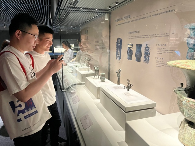 團(tuán)員青年們首先集體參觀了“三星堆?長(zhǎng)江流域青銅文明展”。作為二十世紀(jì)人類最偉大的考古發(fā)現(xiàn)之一,三星堆遺址被譽(yù)為“長(zhǎng)江文明之源”。通過(guò)生動(dòng)詳實(shí)的介紹,團(tuán)員們深入了解了黃金面具、青銅人像等三星堆“頂流”文物,領(lǐng)略了長(zhǎng)江流域青銅文明的歷史光輝和璀璨成就。