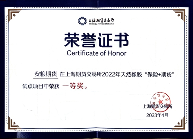 近日,上海期貨交易所對2022年天然橡膠“保險+期貨”試點項目進(jìn)行結(jié)項評審,安糧期貨在海南省樂東黎族自治縣開展的“保險+期貨”項目中表現(xiàn)優(yōu)異,榮獲2022年天然橡膠“保險+期貨”試點項目一等獎。