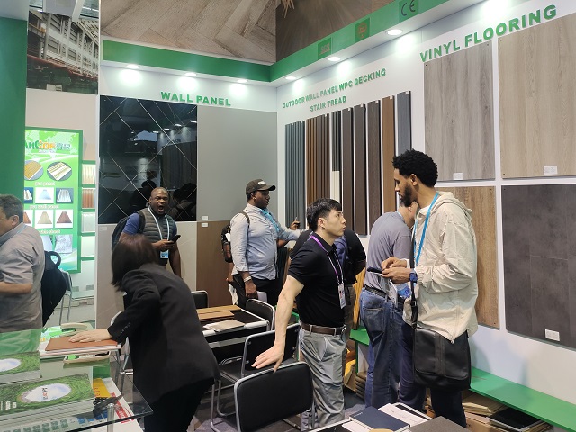 建材展位重點(diǎn)推出了墻板,格柵,樓梯踏板以及木塑戶外地板等新產(chǎn)品,從室內(nèi)到戶外產(chǎn)品一應(yīng)俱全。參展部門根據(jù)對(duì)去年秋季交易會(huì)的考察分析以及近期客戶最新詢盤(pán)情況的整合梳理,積極開(kāi)拓更新參展產(chǎn)品。結(jié)合國(guó)外最新流行的趨勢(shì),推出了拼花木紋,石紋等當(dāng)下十分暢銷的花色。利用立體燈箱,將產(chǎn)品優(yōu)勢(shì),產(chǎn)品結(jié)構(gòu)剖面等信息直觀展示,讓客戶更加清晰地了解產(chǎn)品的性能和優(yōu)點(diǎn),吸引諸多專業(yè)買家的觀看和洽談。此外,在攤位新增產(chǎn)品拼裝的體驗(yàn)區(qū),增加產(chǎn)品小樣及配件的DIY拼裝,吸引客戶自己動(dòng)手,大大提升了參與度和體驗(yàn)感,讓客戶真切地感受到安糧的誠(chéng)意與新意。