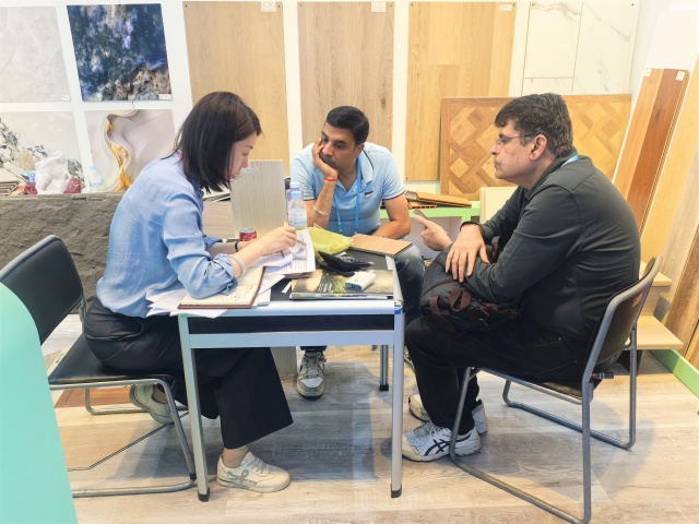 建材展區(qū)中,安糧以差異化策略布局全球市場。UV亮面墻板采用卡扣式快裝結(jié)構(gòu),安裝便捷、節(jié)省工時(shí),深受東南亞客商青睞;為南美、中東定制的3D打印花色與鎏金花紋墻板,支持紋樣和尺寸個(gè)性化定制,滿足高端空間的獨(dú)特審美。